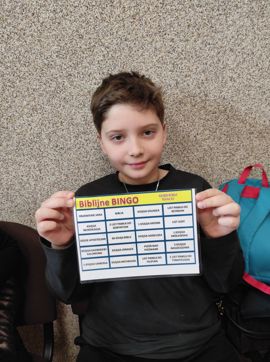 Uczyliśmy się, jak odszukiwać informacje w tekstach biblijnych za pomocą sigl, graliśmy w Bingo biblijne, poznając nazwy ksiąg Pisma Świętego, a także dzieliliśmy się wiedzą o tym, jak powstała Biblia i co nam mówi o Bogu.