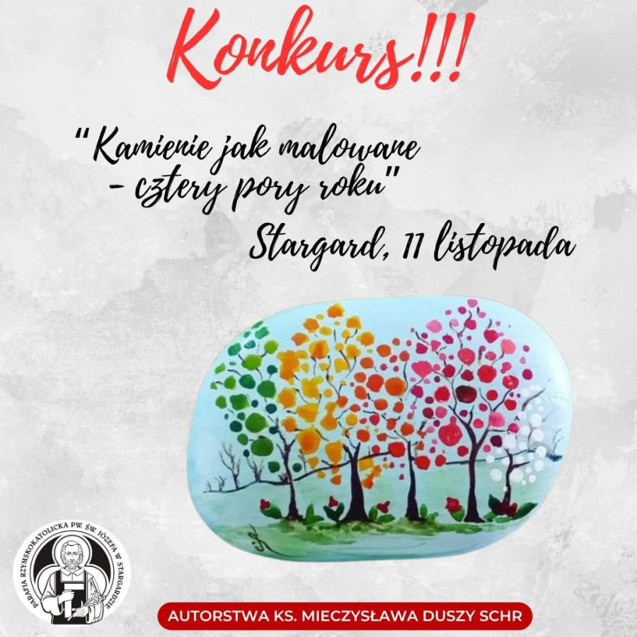 11. listopada odbyła się kolejna edycja Konkursu "Kamienie jak malowane". W tym roku tematyka obejmowałą cztery pory roku. Gratulujemy uczestnikom konkursu. Prosimy o odbiór nagrody w najbliższą niedzielę, 16 listopada po Mszy Świętej o godz.11:00