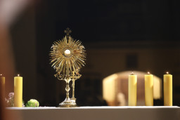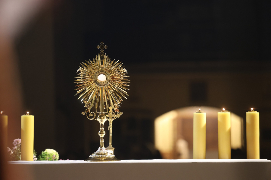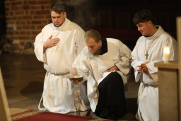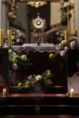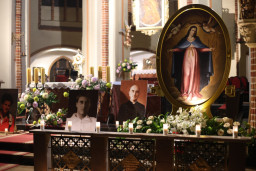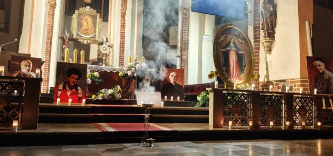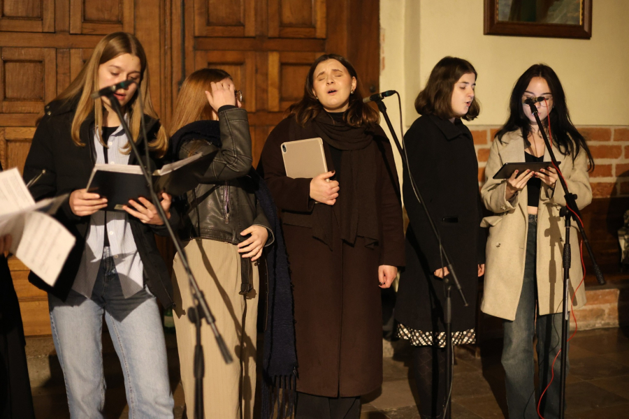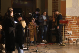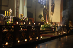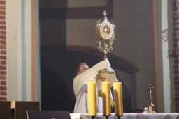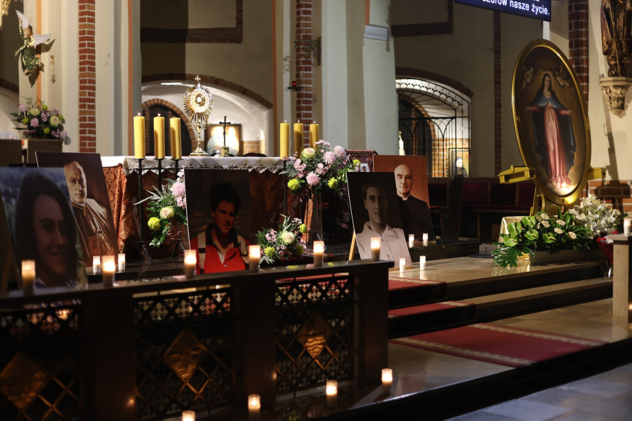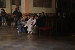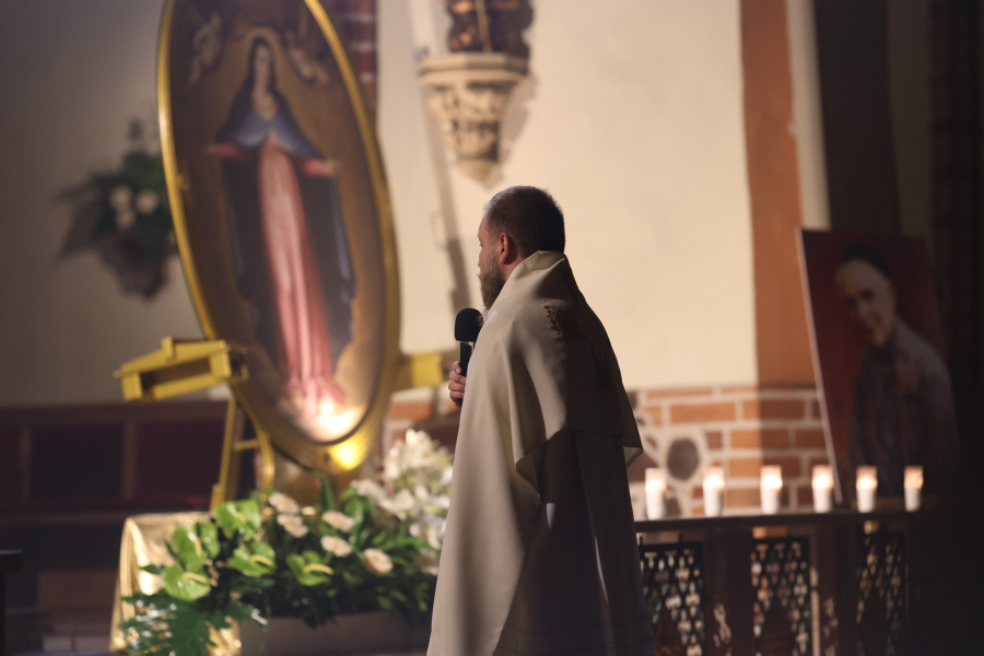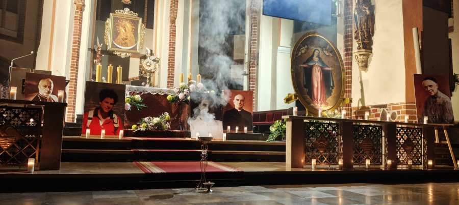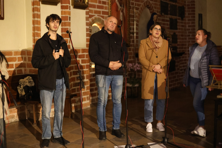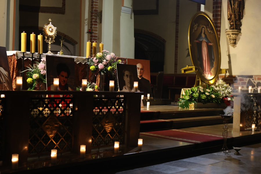 NOC ŚWIĘTYCH, czyli modlitewne czuwanie ze Świętymi, po Uroczystej Mszy Świętej rozpoczęła się adoracja Najświętszego Sakramentu. Muzycznemu Wielbieniu prowadzonemu przez Duszpasterstwo Młodzieży Wieczernik towarzyszyli niedawno kanonizowani św. Carlo Acutis oraz św. Pier Giorgio Frassati.