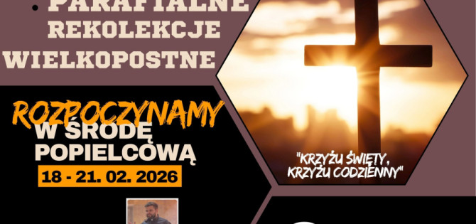 PARAFIALNE REKOLEKCJE WIELKOPOSTNE przeżywać będziemy od Środy Popielcowej 18.02. do soboty 21.02.2026 z hasłem: „Krzyżu święty, Krzyżu codzienny”. Poprowadzi je pallotyn, ks. Bartosz Olszewski SAC - Dyrektor Pallotyńskiego Centrum Młodzieży „Apostoł”. Program jest dostępny poniżej. Już dzisiaj zachęcamy do zaplanowania udziału w rekolekcjach.