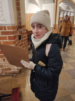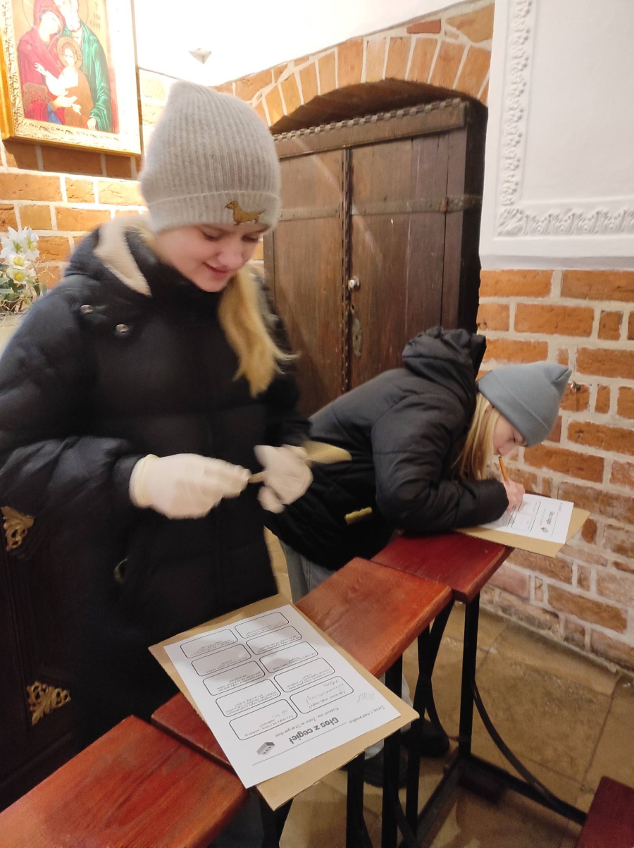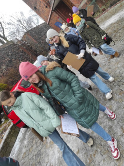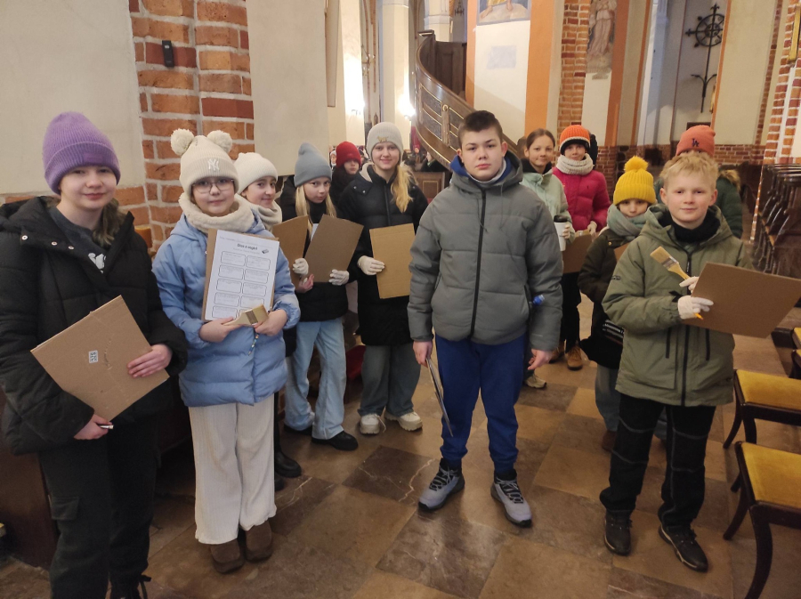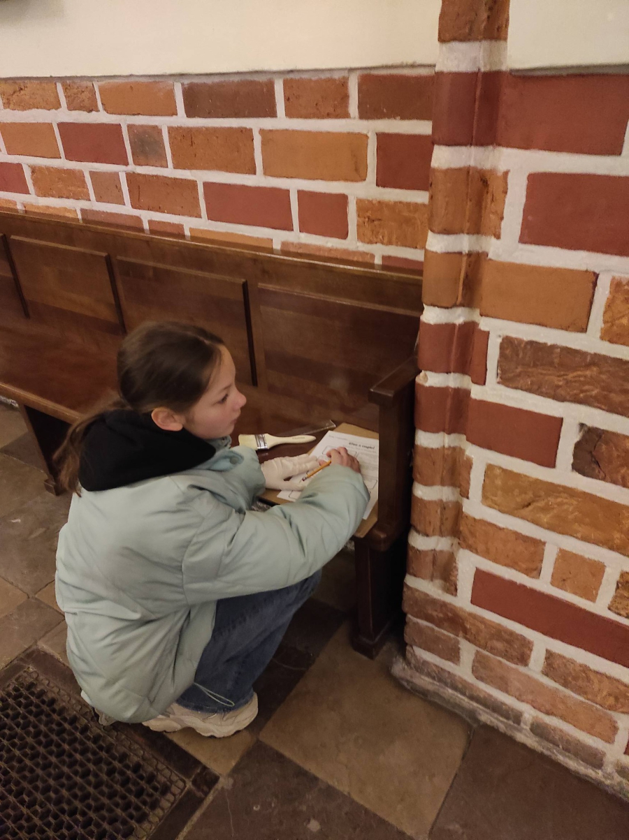 Po krótkiej integracji zabraliśmy się do pracy – i to dosłownie pracy z cegłami. Każdy uczestnik otrzymał „swój” fragment muru w kościele i badał go jak prawdziwy specjalista: kolor i odcień cegły, kształt i wymiary, fakturę i jakość wypału, możliwy czas powstania.