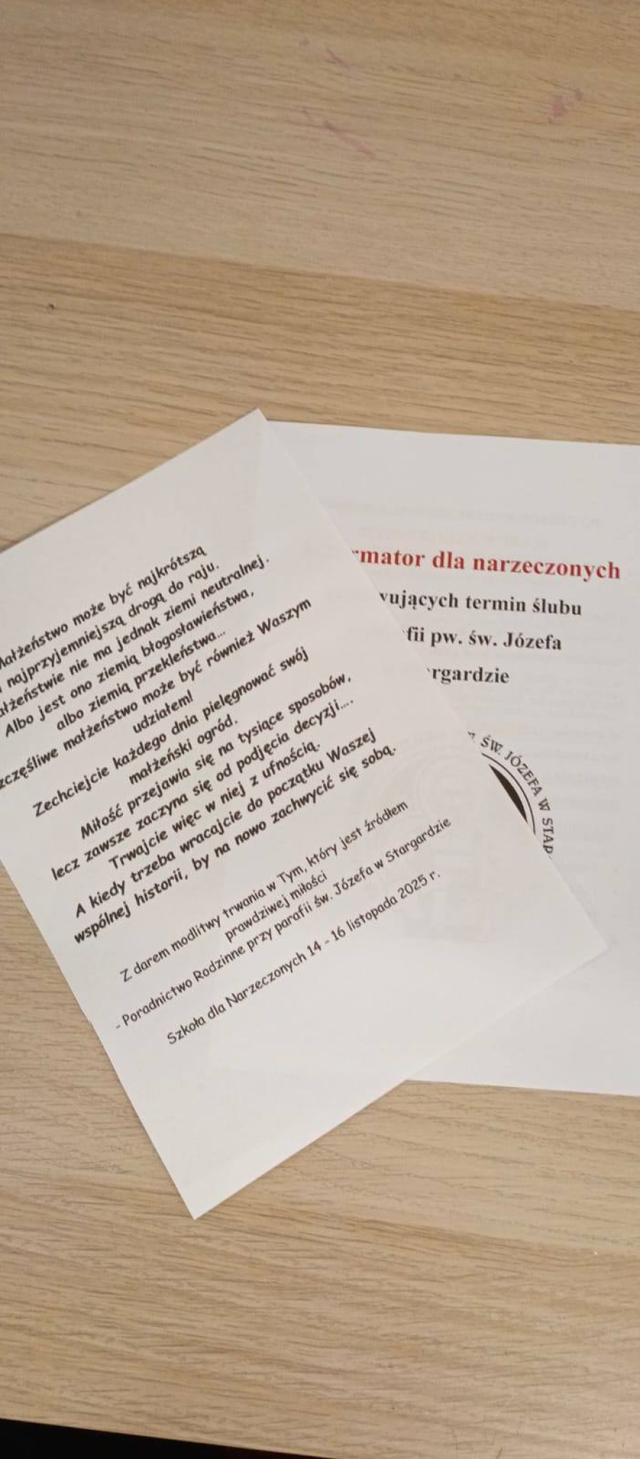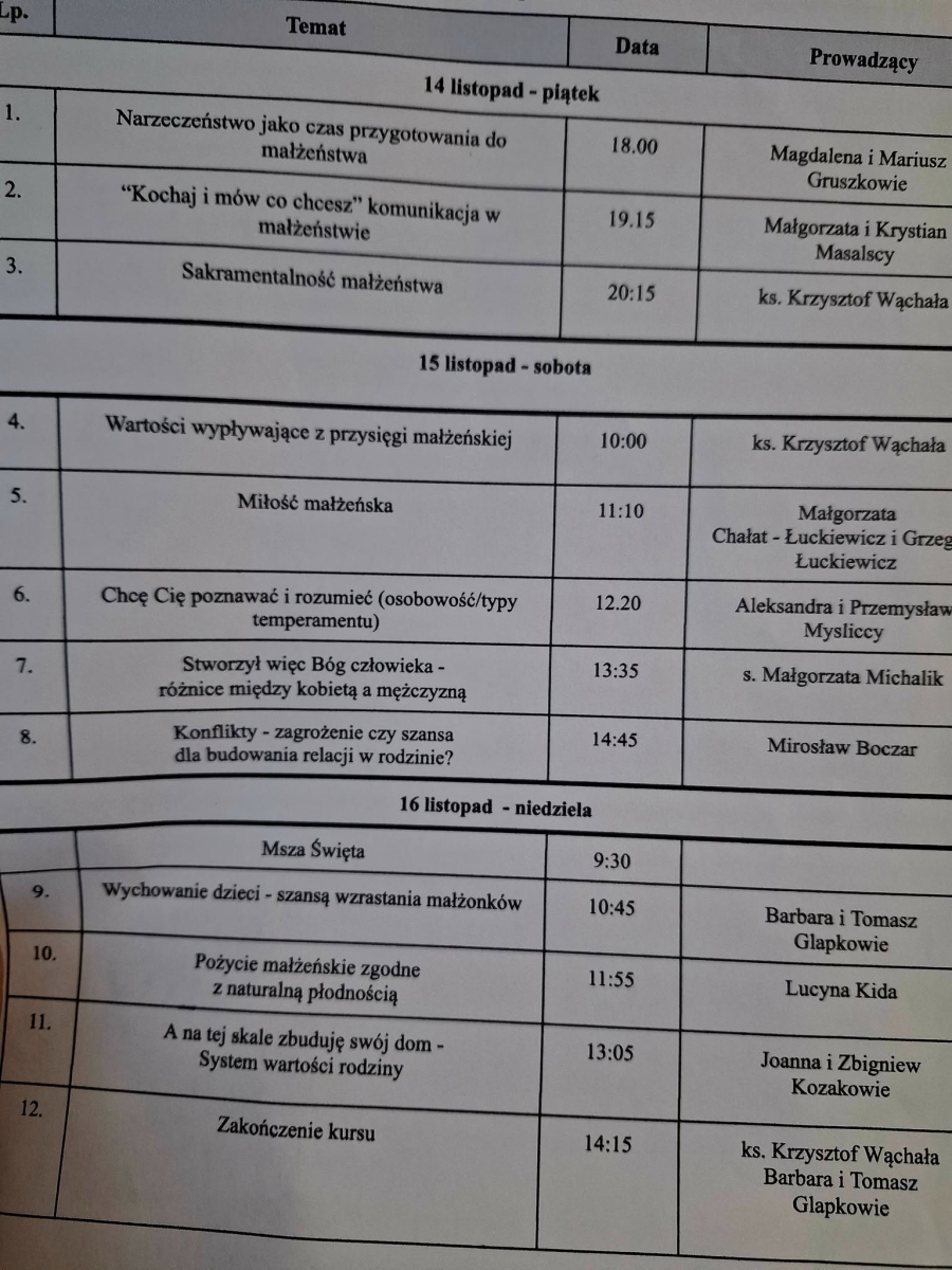 W dniach od 14.- 16.11. odbyła się jesienna edycja SZKOŁY DLA NARZECZONYCH. Podczas serii wykłądów i warsztatów, prowadzonych przez naszych parafialnych specjalstów od życia rodzinnego i małżeńskiego oraz sakramentalnego, narzeczeni przygotowaywali się aktywnie do zawarcia sakramentalnego małżeństwa.