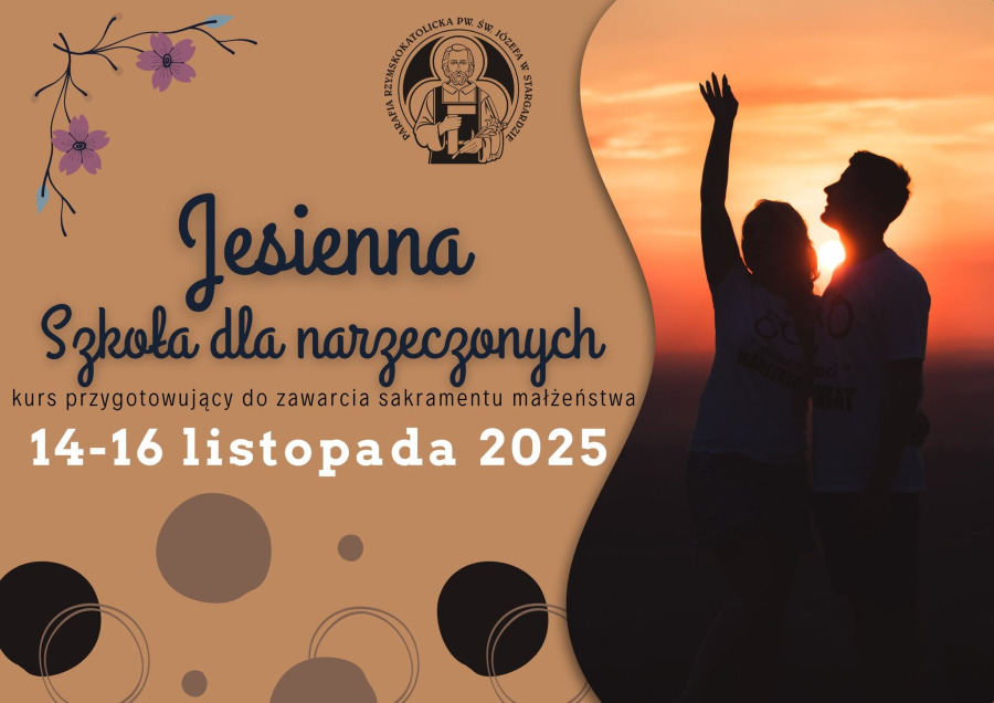 W dniach, 14-16 listopada (piątek-niedziela) 2025 organizujemy WEEKENDOWY KURS PRZEDMAŁŻEŃSKI dla par, które planują zawarcie sakramentalnego małżeństwa. Rozpoczynamy 14 listopada o godz. 18:00 w parafialnym Domu św. Józefa.
