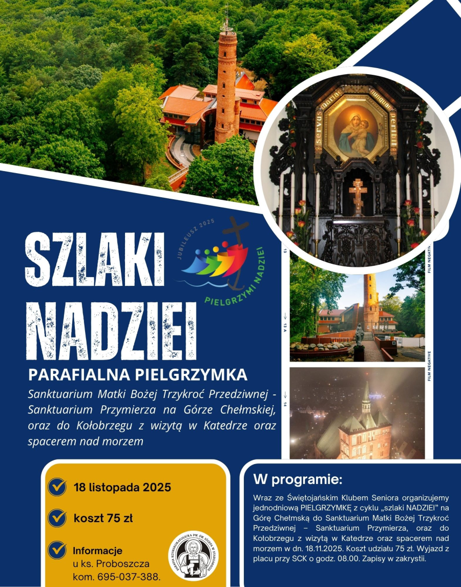 Wraz ze Świętojańskim Klubem Seniora organizujemy jednodniową PIELGRZYMKĘ z cyklu „szlaki NADZIEI” na Górę Chełmską do Sanktuarium Matki Bożej Trzykroć Przedziwnej – Sanktuarium Przymierza, oraz do Kołobrzegu z wizytą w Katedrze oraz spacerem nad morzem.