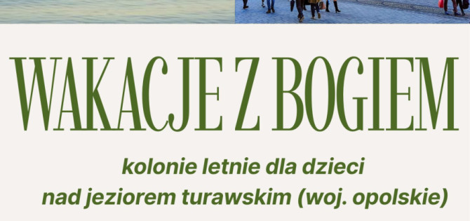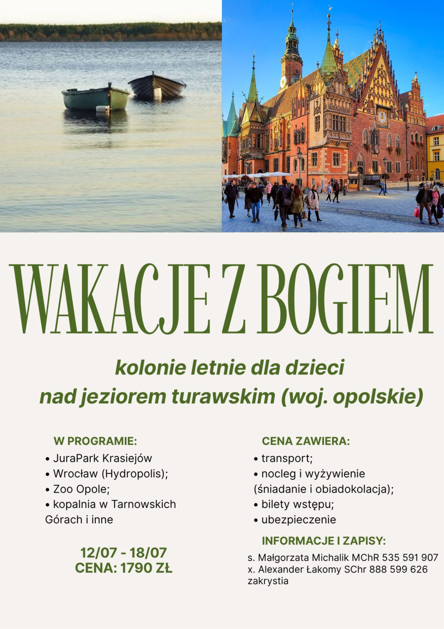 Zapraszamy dzieci z klas I-VI na kolonie letnie „Wakacje z Bogiem”, które odbędą się w dniach 12–18.07.2026 nad Jeziorem Turawskim (woj. opolskie). W programie m.in.: JuraPark Krasiejów, Wrocław, ZOO Opole, kopalnia Srebra, Tarnowskie Góry. Koszt wyjazdu: 1790 zł. Zapisy trwają do końca maja wraz z zaliczką 200zł w zakrystii