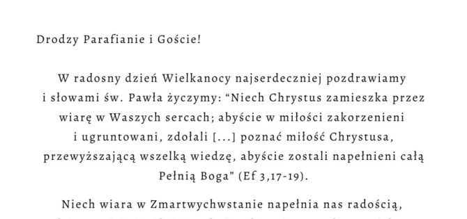 W radosny dzień Wielkanocy najserdeczniej pozdrawiamy i słowami św. Pawła życzymy: “Niech Chrystus zamieszka przez wiarę w Waszych sercach; abyście w miłości zakorzenieni i ugruntowani, zdołali [...] poznać miłość Chrystusa, przewyższającą wszelką wiedzę, abyście zostali napełnieni całą Pełnią Boga” (Ef 3,17-19).