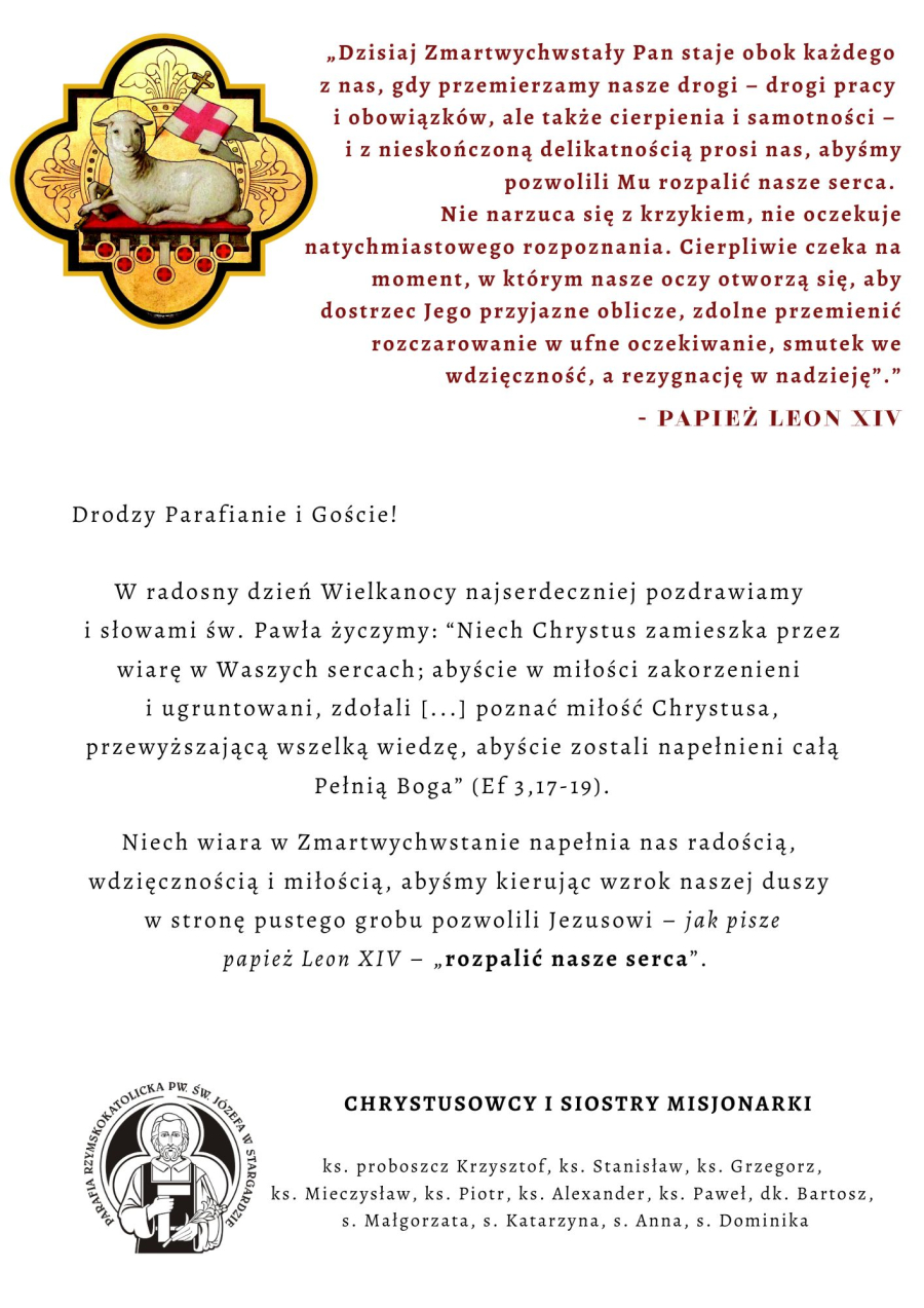 Niech wiara w Zmartwychwstanie napełnia nas radością, wdzięcznością i miłością, abyśmy kierując wzrok naszej duszy w stronę pustego grobu pozwolili Jezusowi – jak pisał papież Leon XIV – „rozpalić nasze serca”.